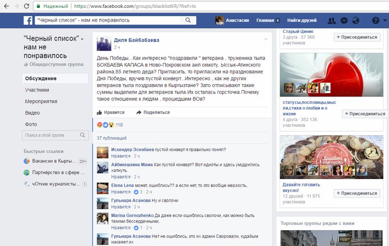 Отметим, что пользователь Facebook Диля Байбабаева в группе «Черный список» написала: «День Победы… Как интересно «поздравили» ветерана, труженика тыла Капаса Бокбаева в Новопокровском айыл окмоту Ысык-Атинского района, 85-летнего деда? Пригласить-то пригласили на празднование Дня Победы, вручив пустой конверт… Интересно, как же других ветеранов тыла поздравили в Кыргызстане? Зато отписывают такие суммы. Их осталась горсточка. Почему такое отношение к людям, прошедшим ВОВ?»