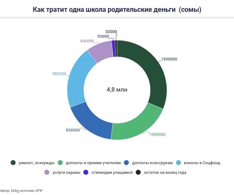 Суммы сборов варьируются. По словам Султана Майрамбекова, в одной из бишкекских школ за 2016 год собрали около 5 миллионов сомов. Большую часть направили на ремонт и хознужды, доплаты и премии учителям, взносы в Соцфонд. И весьма скромную часть собранных средств — 53 тысячи сомов — на стипендии учащимся. И на том спасибо.