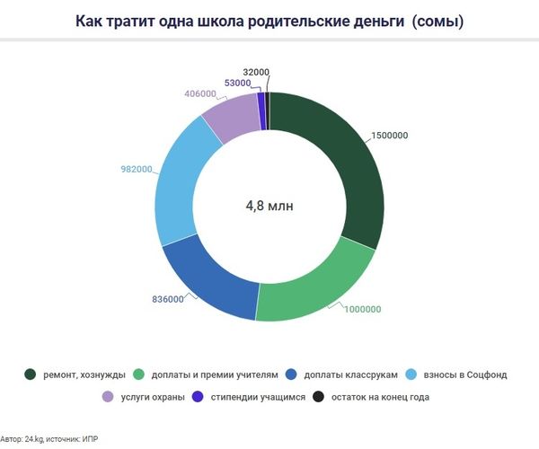 «Почти 5 миллионов сомов для одной школы — это много. Но это столица. В сельских школах собирают в разы меньше — до 100 тысяч сомов. И эти деньги идут в основном на ремонт, — отметил Султан Майрамбеков. — Когда мы проводили первые общественные слушания по бюджету школ в сельских регионах несколько лет назад, ставили цель снизить сумму добровольных взносов. Но после обсуждения родители пришли к обратному выводу и повысили сумму сборов с 70 до 120 сомов. Сделали это ради своих же детей, поскольку средств из республиканского бюджета не хватает».