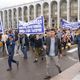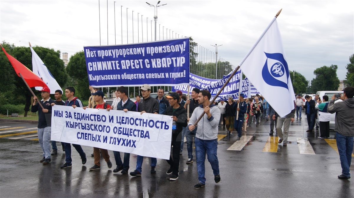Несколько сотен инвалидов по слуху и зрению идут на пикет в сквер имени Горького в Бишкеке. Участники акции «За единство Кыргызского общества слепых и глухих» прошли площадь Ала-Тоо.