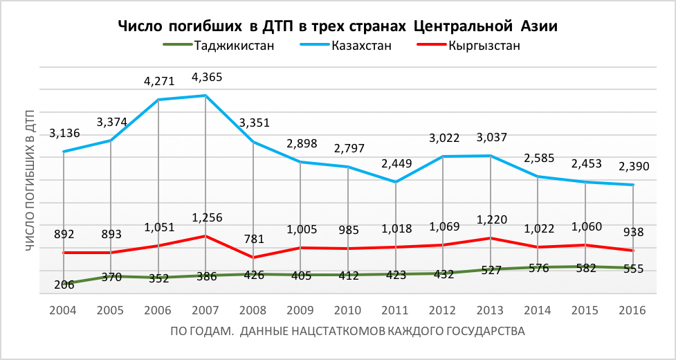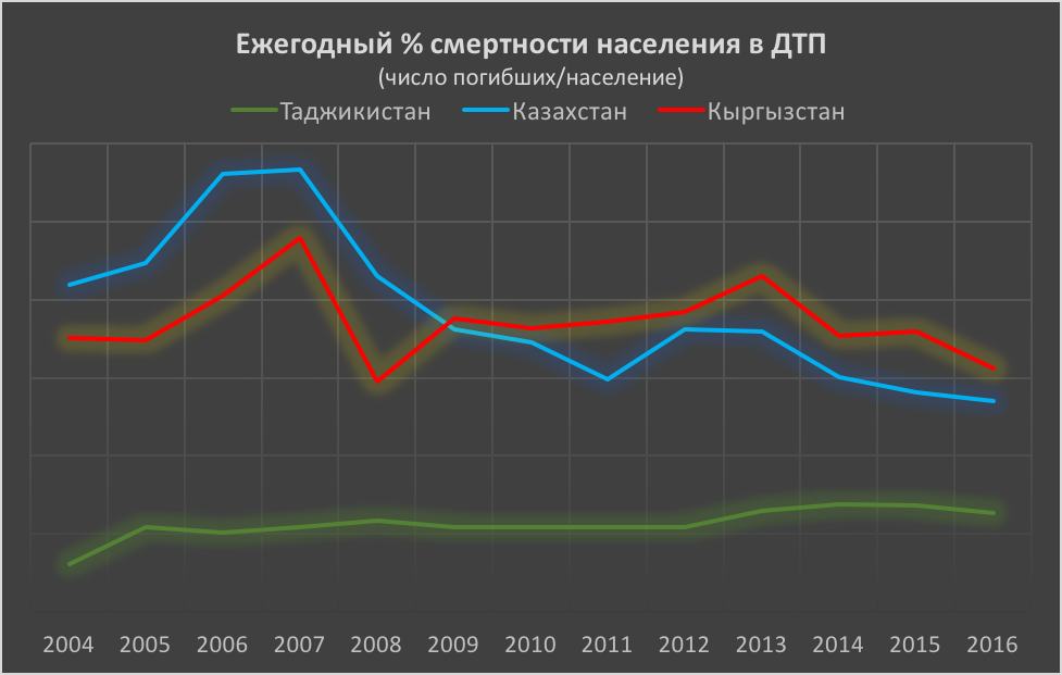 В 2016 году в ДТП в Кыргызстане погибло 0,00156 процента населения, в Казахстане — 0,00135 процента, в Таджикистане — 0,00063 процента. В Таджикистане смертность на дорогах в два раза ниже, чем в соседних Кыргызстане и Казахстане.