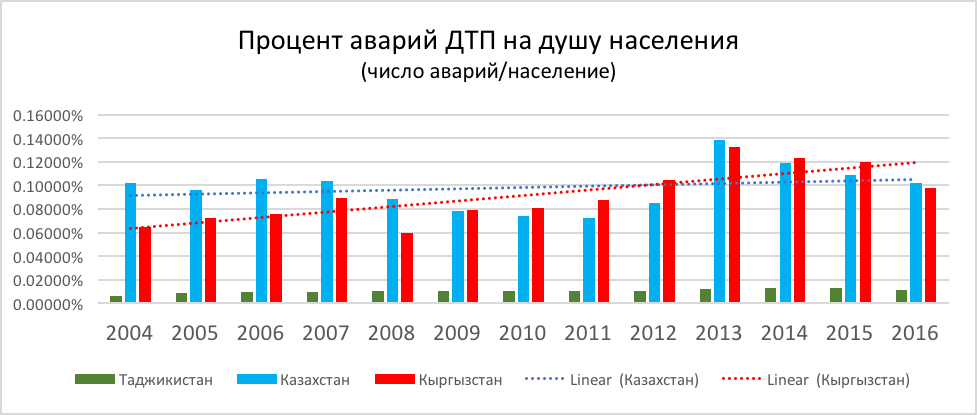 И по травматизму на дорогах Кыргызстан опередил Казахстан в 2009 году и с тех пор не уступал роль лидера по проценту ранений в ДТП на душу населения. За исключением 2016 года, когда страна немного уступила Казахстану.