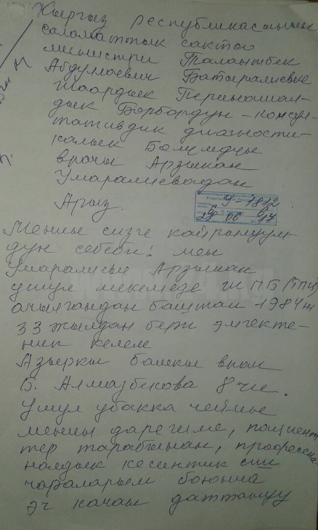 «На основании этой справки приняли решение о моем увольнении, я написала возражение по каждому пункту. Очень много фактов были натянуты. Через полгода пришла повторная проверка. Они ссылаются на нарушения. Одна жалоба от женщины, которой удалили матку, но это заявление уже разбиралось пять раз как минимум. Есть и жалоба уволенной сотрудницы, но даже суд вынес решение, что увольнение обоснованно. Теперь эти жалобы рассматриваются повторно», — отметила Бурул Алмазбекова.