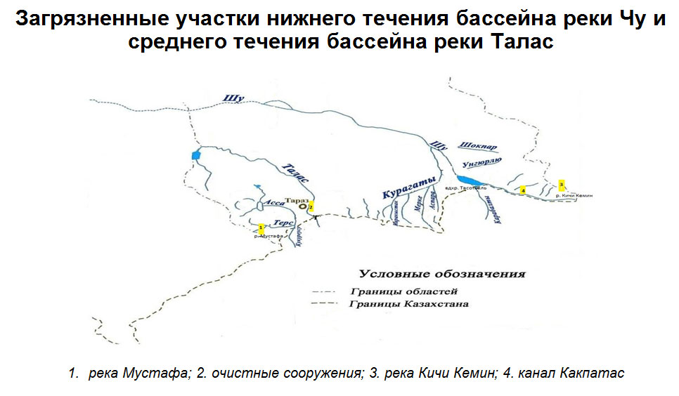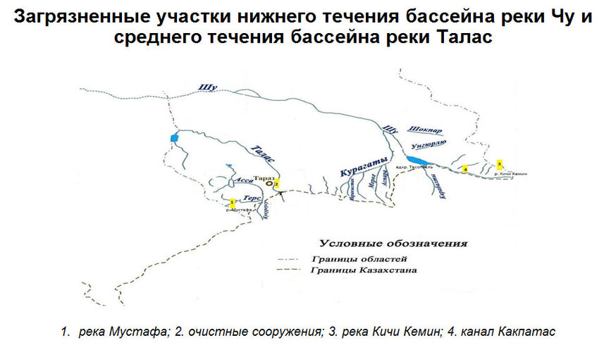 В среднем и нижнем течении бассейна реки Талас превышены показатели по взвешенным веществам, сульфатам, кремнию, железу, хрому, кадмию, нефтепродуктам, фторидам, марганцу.