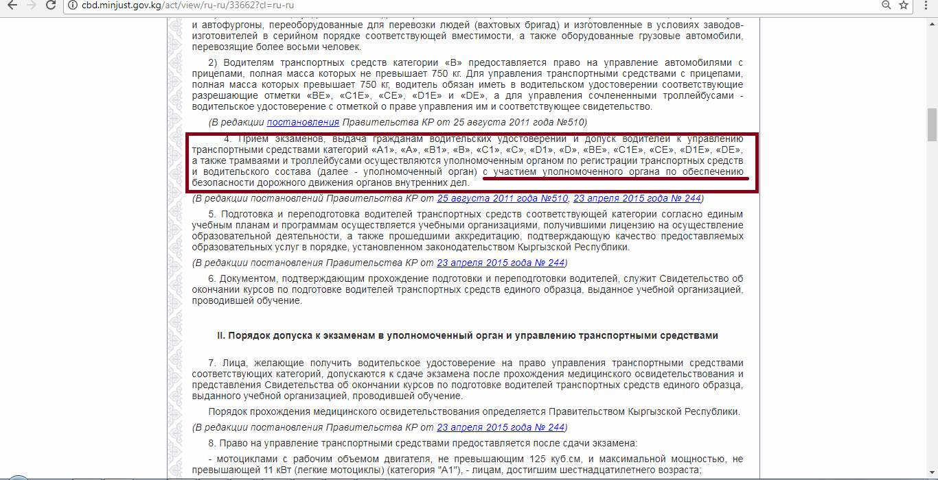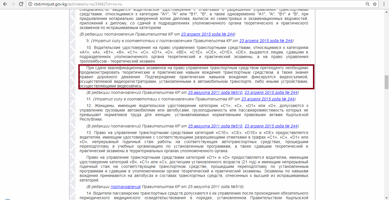 Или, например, в том же Положении прописано, что прием экзаменов осуществляется с участием уполномоченного органа по обеспечению безопасности. Но мы же уже выяснили, кто у нас в стране обеспечивает безопасность на дорогах.Известно, что с апреля 2015 года представители МВД на экзаменах не присутствуют, и два года назад мы уже писали об этом. Тогда состоялся интересный диалог с главой ДРТС и ВС Жоошбеком Коеналиевым.
