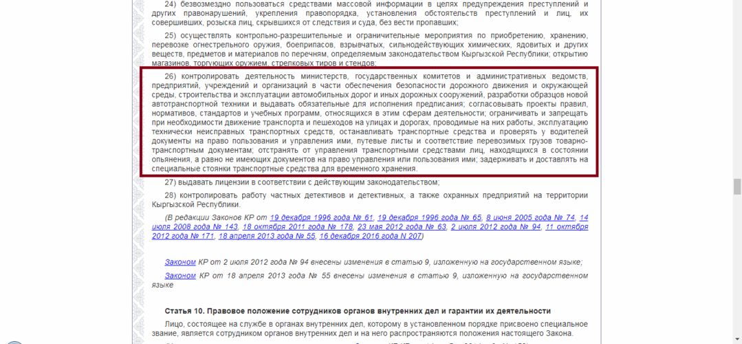 И еще позвольте поинтересоваться, господа, вы о каком «контроле ведомства» речь ведете? О том, которым МВД и так на сегодня обладает? А вы не знали об этом? Напомним, в статье 9 Закона КР «Об органах внутренних дел» четко сказано: