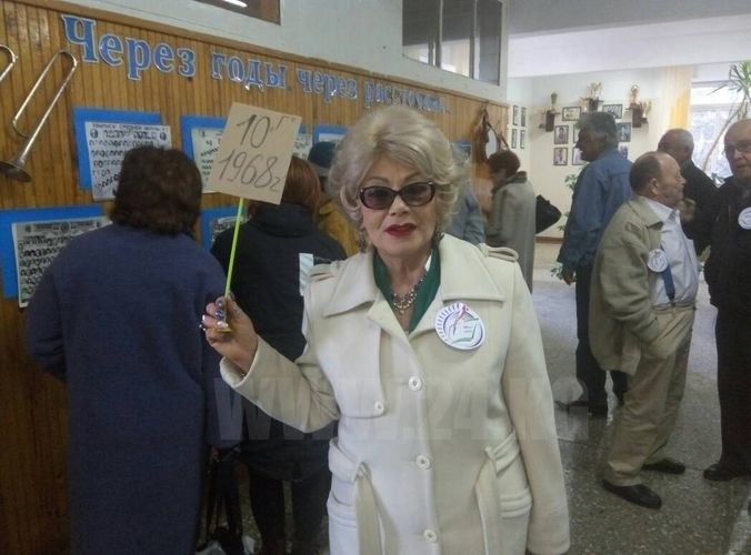 В фойе первые выпускники школы, смеясь, разглядывают школьные фотографии: «Только посмотрите, какими мы были!», «Ой, а это кто?», «Извините, я вас не узнаю, вы в каком классе учились?»