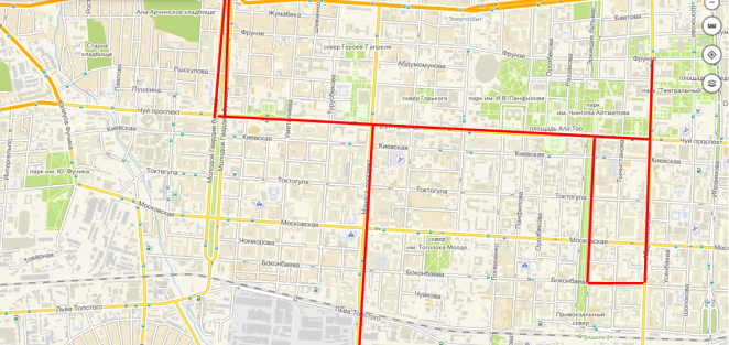 — на улице Абдрахманова (от улицы Фрунзе до улицы Боконбаева);