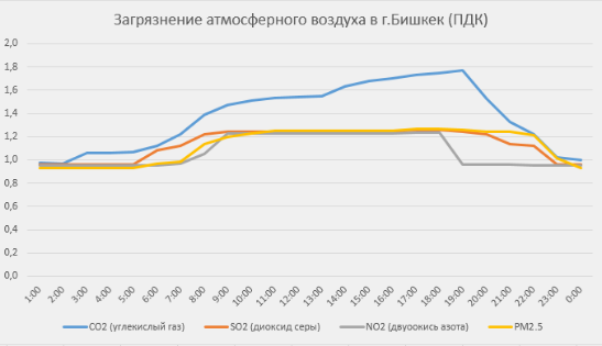 По информации Энергохолдинга, накануне зафиксирован максимум коэффициента загрязнения воздуха. На портале www.aba.kg ежедневно публикуются данные о качестве воздуха. Наибольшие выбросы углекислого газа наблюдаются с 19.00.