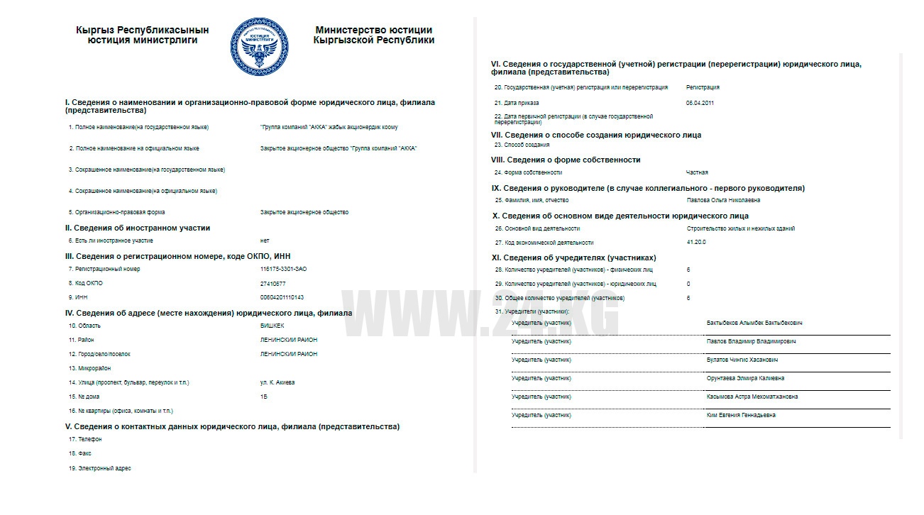 ЗАО «АККА» руководит Ольга Николаевна Павлова. А одним из учредителей ЗАО является Алымбек Бактыбекович Бактыбеков — 27-летний депутат Бишкекского городского кенеша. Он же эксперт Агентства по продвижению инвестиций.