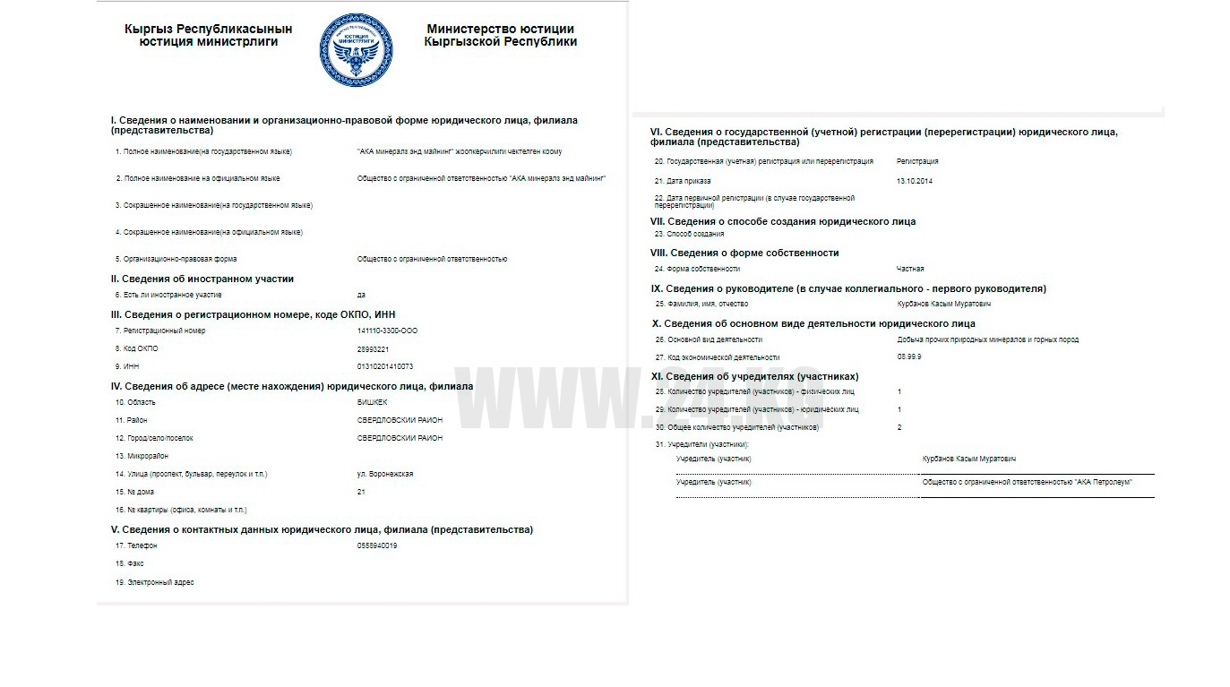 По данным Министерства юстиции, директором и одним из учредителей ОсОО «Ака минералз энд майнинг» числится Касым Муратович Курбанов. Ему 33 года. Он окончил Кыргызскую государственную юридическую академию по специальности «юриспруденция». Кроме того, учредителем этого ОсОО является и «АККА Петролеум», которое, в свою очередь, является одним из звеньев в структуре ЗАО «Группа компаний «АККА».