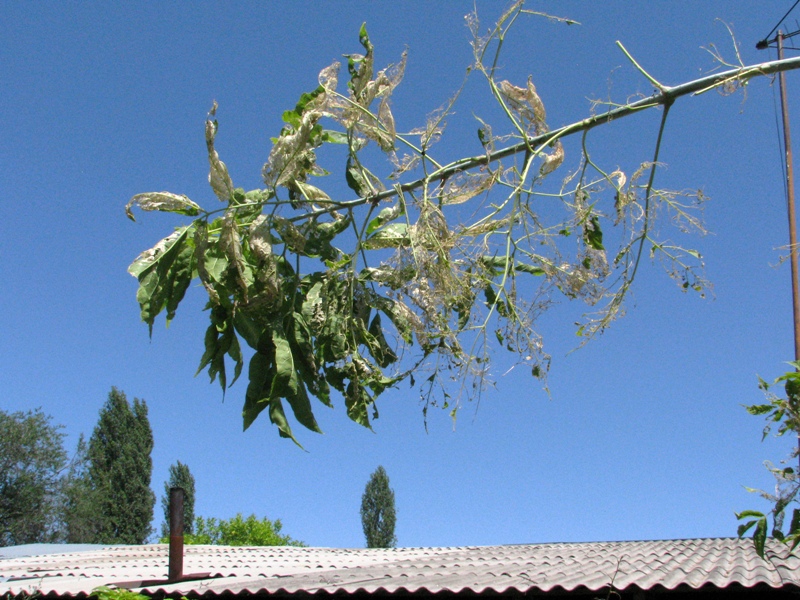 «Позвонили мне однажды из 10-го микрорайона и говорят: «У нас ясень стоит под окнами во дворе. Приезжайте немедленно, он вчера был зеленый, а ночью его инопланетяне сожгли». Ясенем в обиходе часто называют клен американский, это излюбленное кормовое растение АББ. В Бишкеке мы регистрировали АББ также на яблоне, сливе, шелковице, карагаче и кампсисе», — говорит Дмитрий Милько.