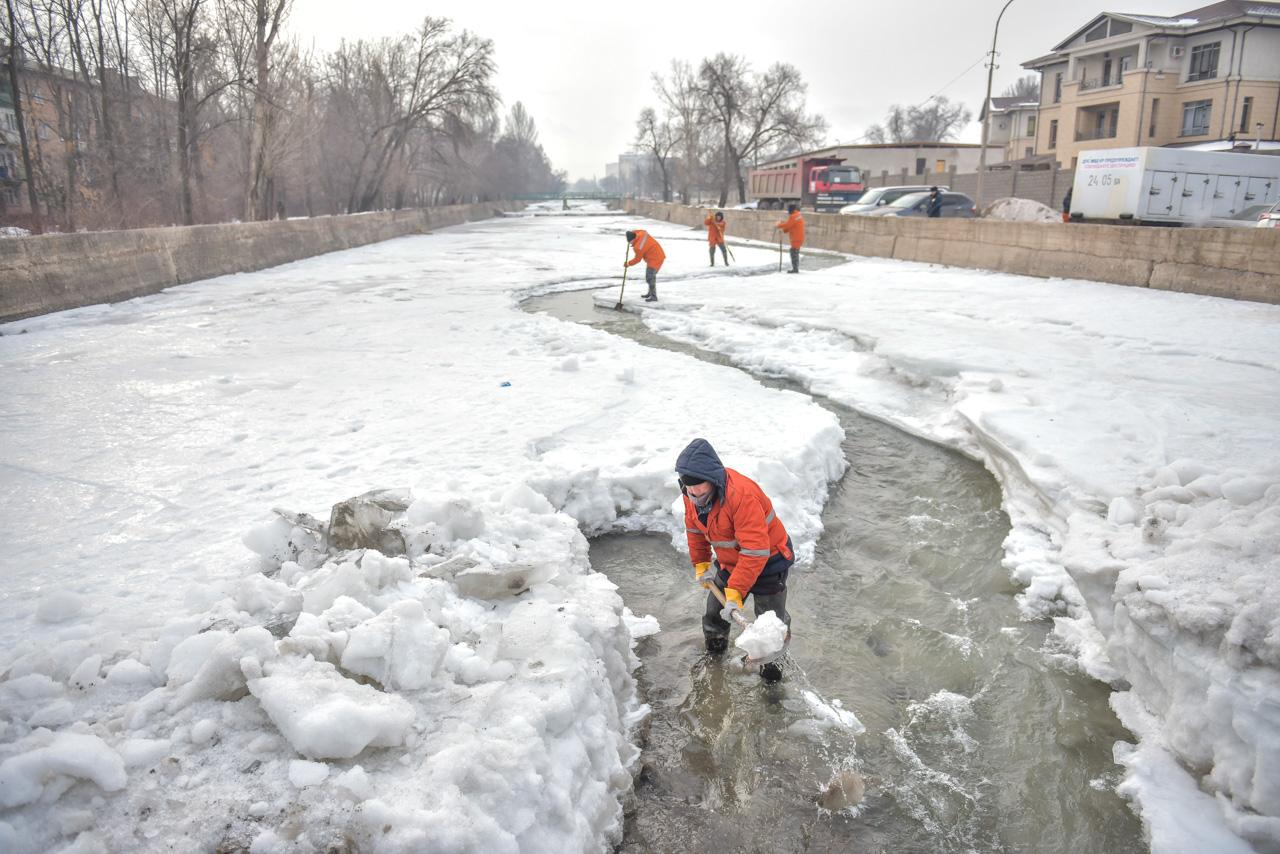 Сейчас на отдельных участках реки на улице Малдыбаева продолжаются очистительные работы по ликвидации снежных заторов и наледи. Постоянно работают 25 человек и шесть единиц спецтехники.