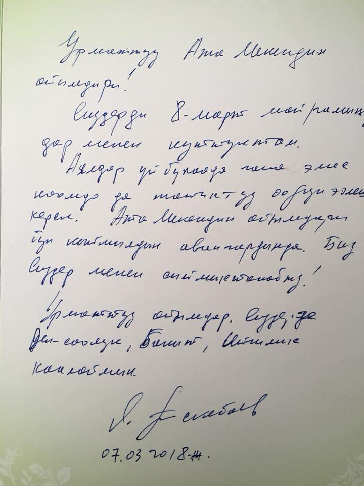 Лидер партии «Ата-Мекен» Омурбек Текебаев поздравил женщин-однопартийцев с Международным женским днем. На этот раз осужденный за коррупцию политик ограничился письмом и не стал создавать открытки, которые ранее он передавал супруге ко дню рождения и на 8 Марта женщинам «Ата Мекена».
