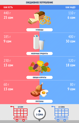 В утвержденный норматив для взрослого человека входят: хлебопродукты — 9 килограммов, мясо — 5 кг, картофель — 8,2 кг, овощи — 9 кг, фрукты и ягоды — 10 кг. А также сахар — 2 кг, молоко — 17 литров и литр растительного масла.