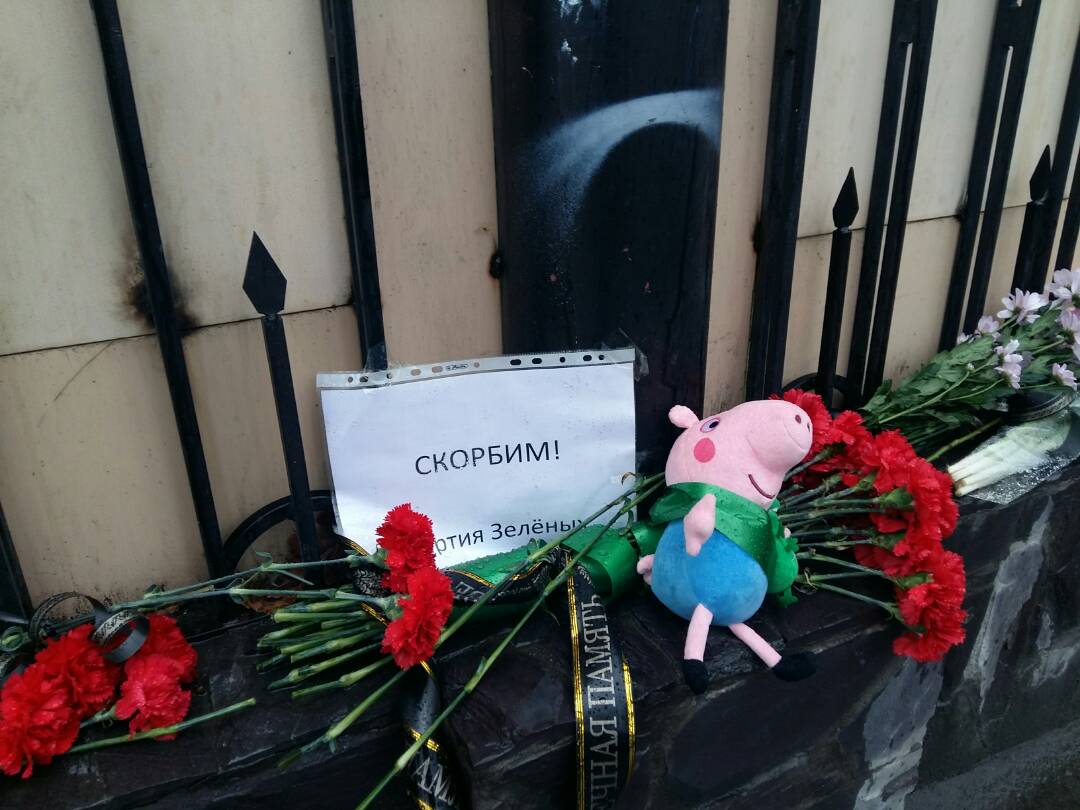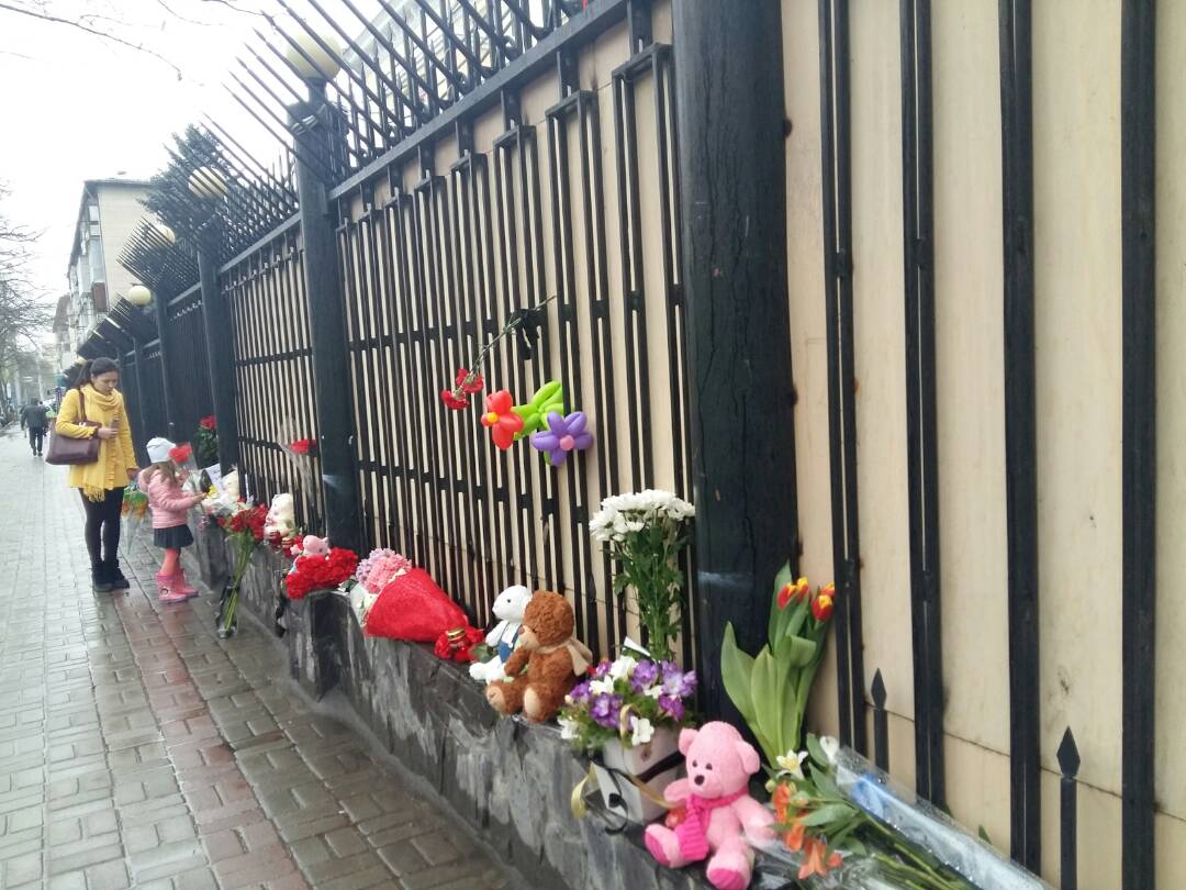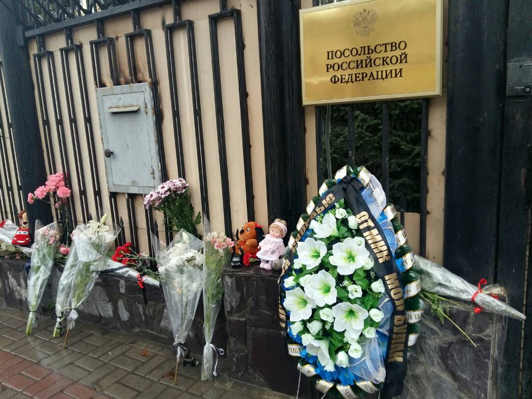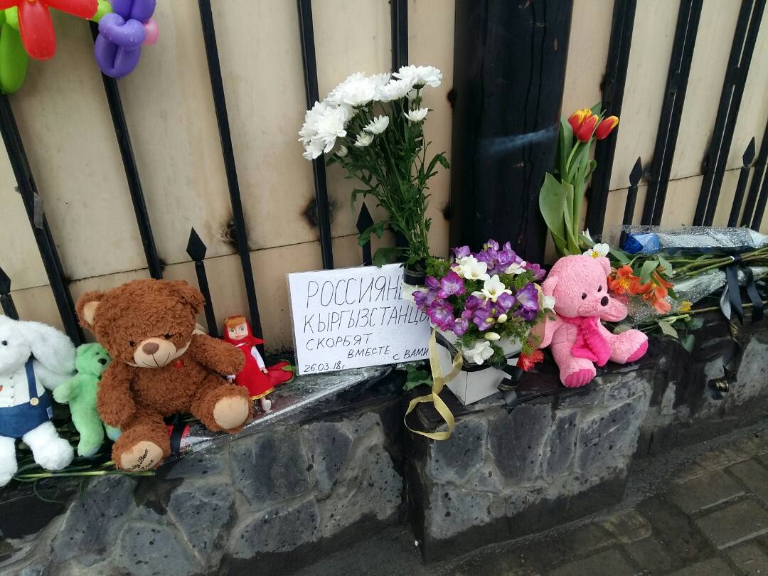 К зданию дипломатической миссии Российской Федерации в Бишкеке сегодня люди несут цветы и мягкие игрушки в память о погибших во время пожара в торговом центре «Зимняя вишня» в городе Кемерово.