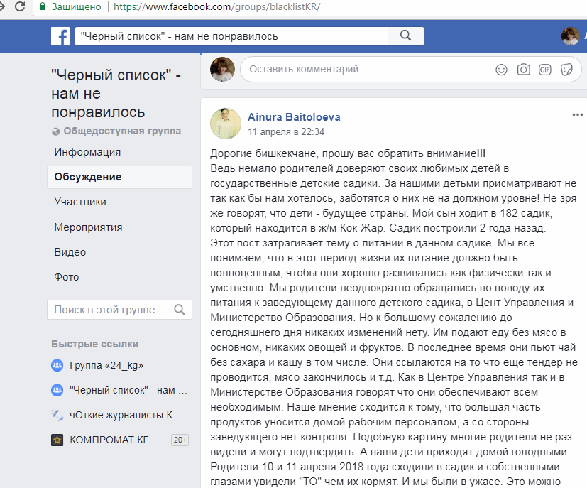 О том, чем кормят детей в столичном детском саду № 182 жилмассива «Кок-Джар», в соцсети Facebook написала Айнура Байтолоева.