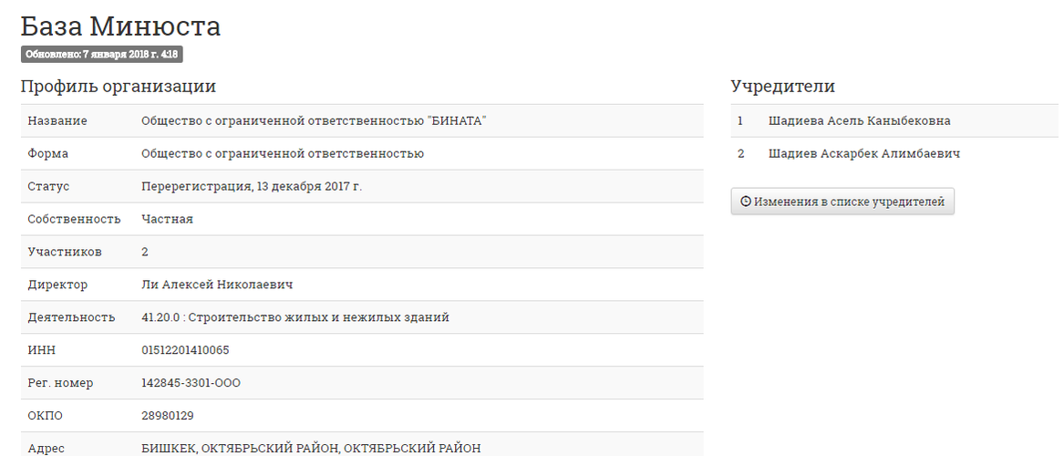 Многоэтажку строит ОсОО «Бината». По данным Министерства юстиции, строительной компанией руководит Алексей Николаевич Ли, учредителями выступают супруги Аскарбек Алимбаевич Шадиев и Асель Каныбековна Шадиева.
