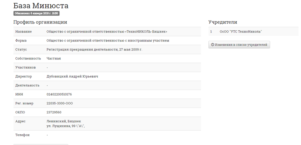ОсОО «ТехноНиколь» поставляло на теплоцентраль строительные материалы. В базе данных Министерства юстиции существует лишь ОсОО с иностранным участием «ТехноНиколь-Бишкек», которым руководит Андрей Дубовицкий.