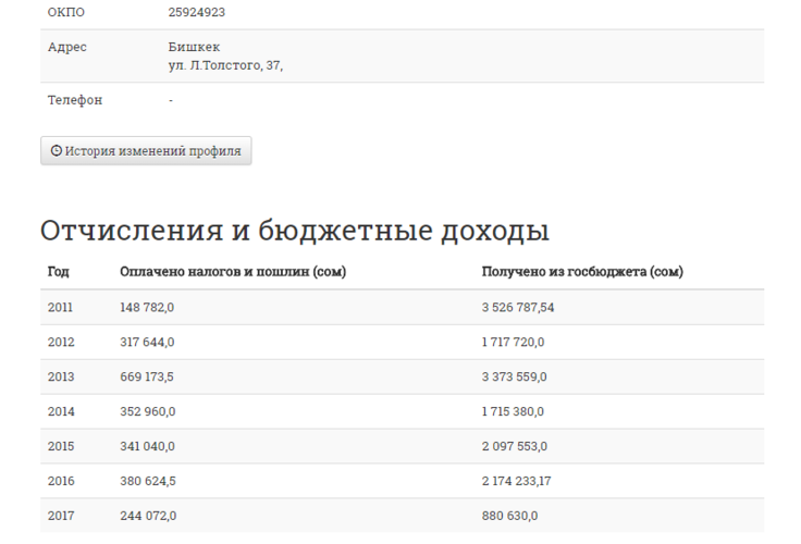 С 2011 года компания стабильно получает от государства заказы и выплаты из республиканского бюджета. Ей платят ежегодно от 1 до 3,5 миллиона сомов. При этом налоговые отчисления мизерные — в среднем 300 тысяч сомов в год.