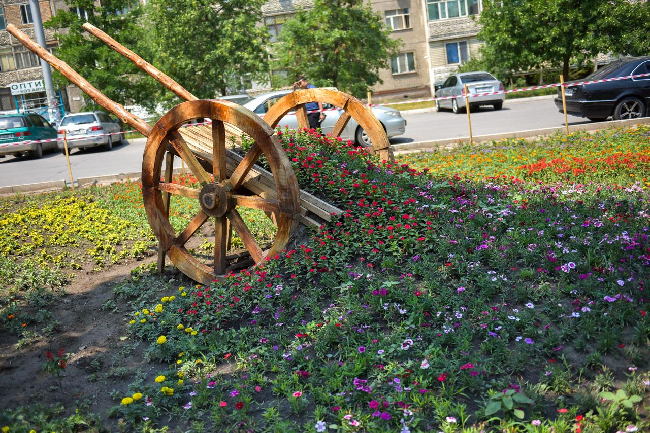 Оригинальные тележка и мостик, сделанные из дерева мастерами предприятия, также стали украшением цветочной клумбы по улице Ауэзова. Там высадили более 30 тысяч цветов. Вдоль тротуара, напротив клумбы, для удобства горожан установлены восемь скамеек. Этот зеленый уголок стал отличным местом для досуга бишкекчан.