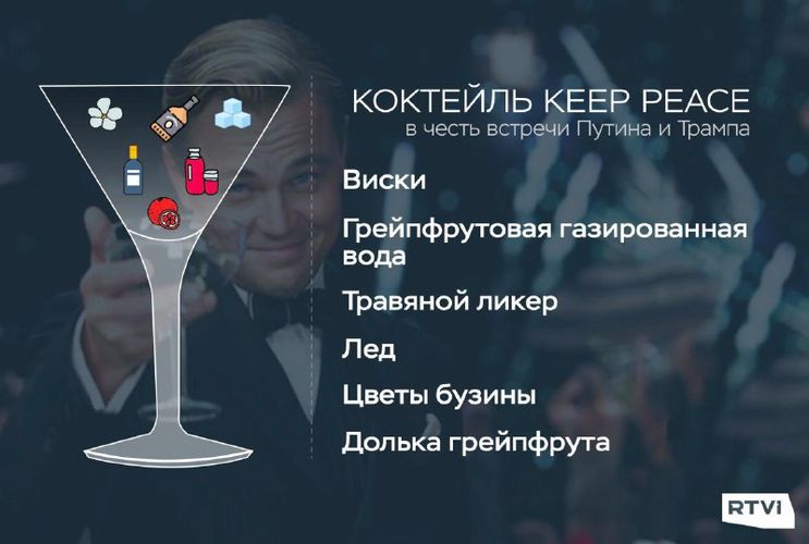 Группа отелей Kmp, расположенных в центре Хельсинки, начала продавать коктейль под названием Keep peace («Сохраняйте мир») в честь встречи президентов РФ и США Владимира Путина и Дональда Трампа. Об этом сообщил ТАСС.