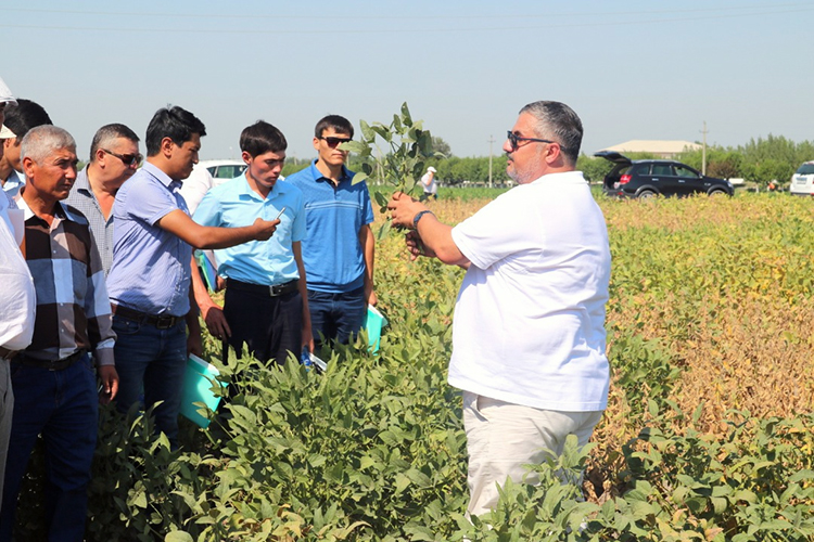 На экспериментальном поле в Андижане эксперты из четырех стран — Кыргызстана, Казахстана, Узбекистана и России — обменялись опытом по выращиванию адаптированных к почвенно-климатическим условиям Ферганской долины новых сортов сои, подсолнечника, кукурузы, сорго и других культур, которые представили россияне.