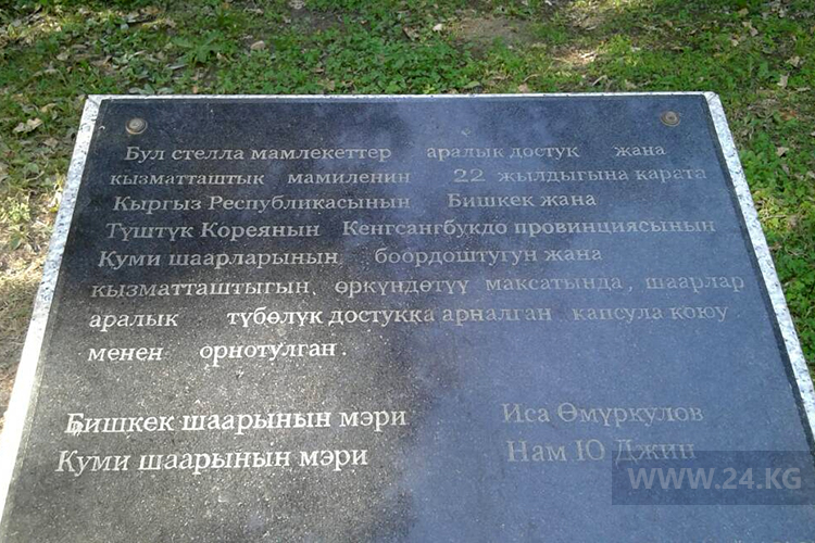 Надпись на ее верхней плите гласит, что установлена она «в честь 22-летия дружественных отношений и сотрудничества между городом Бишкеком Кыргызской Республики и Куми провинции Кенгсангбукдо Южной Кореи с целью развития братства, сотрудничества и вечной дружбы».