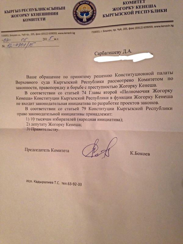 Депутат парламента Кыргызстана продемонстрировал незнание Конституции и собственных полномочий. Сегодня в социальных сетях появился ответ на запрос некоего Д.А.Сарбагишева, подписанный председателем комитета по законности, правопорядку и борьбе с преступностью Кенжебеком Бокоевым.