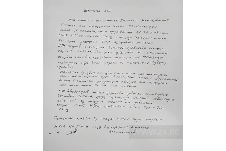 В объяснительных военнослужащих войсковой части 36806 указано, что Арзымбек Абдыкулов не посещал занятия во время сбора мобилизационного резерва. Кроме того, мужчина угрожал тем, что генерал Райимберди Дуйшенбиев за 6 секунд уволит с должности заместителя командра части по боевой подготовке майора Мунарбека Шакенова.