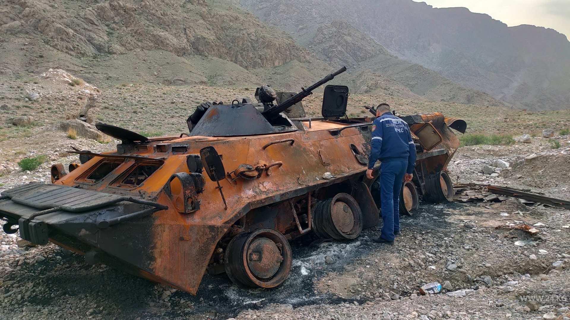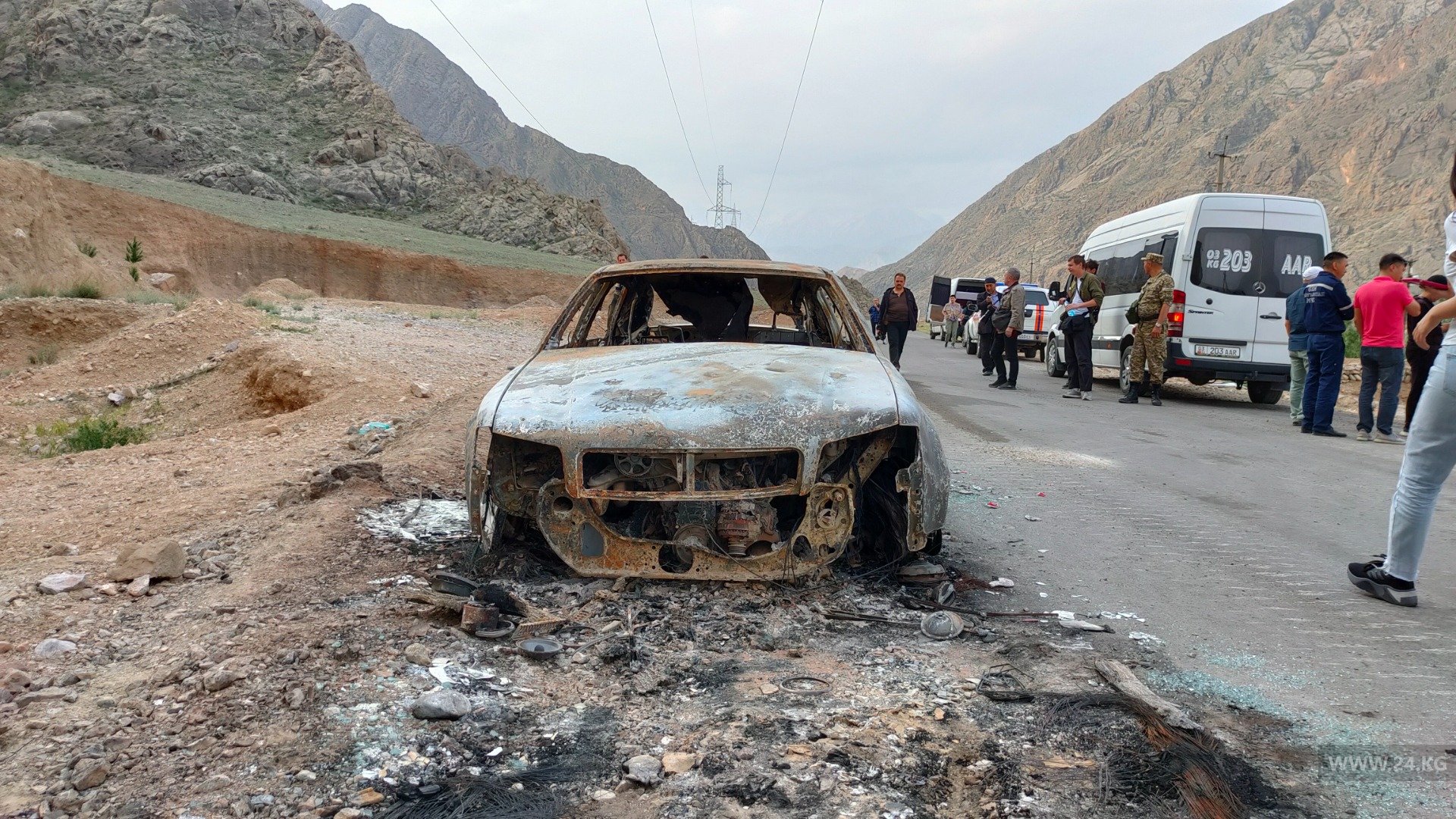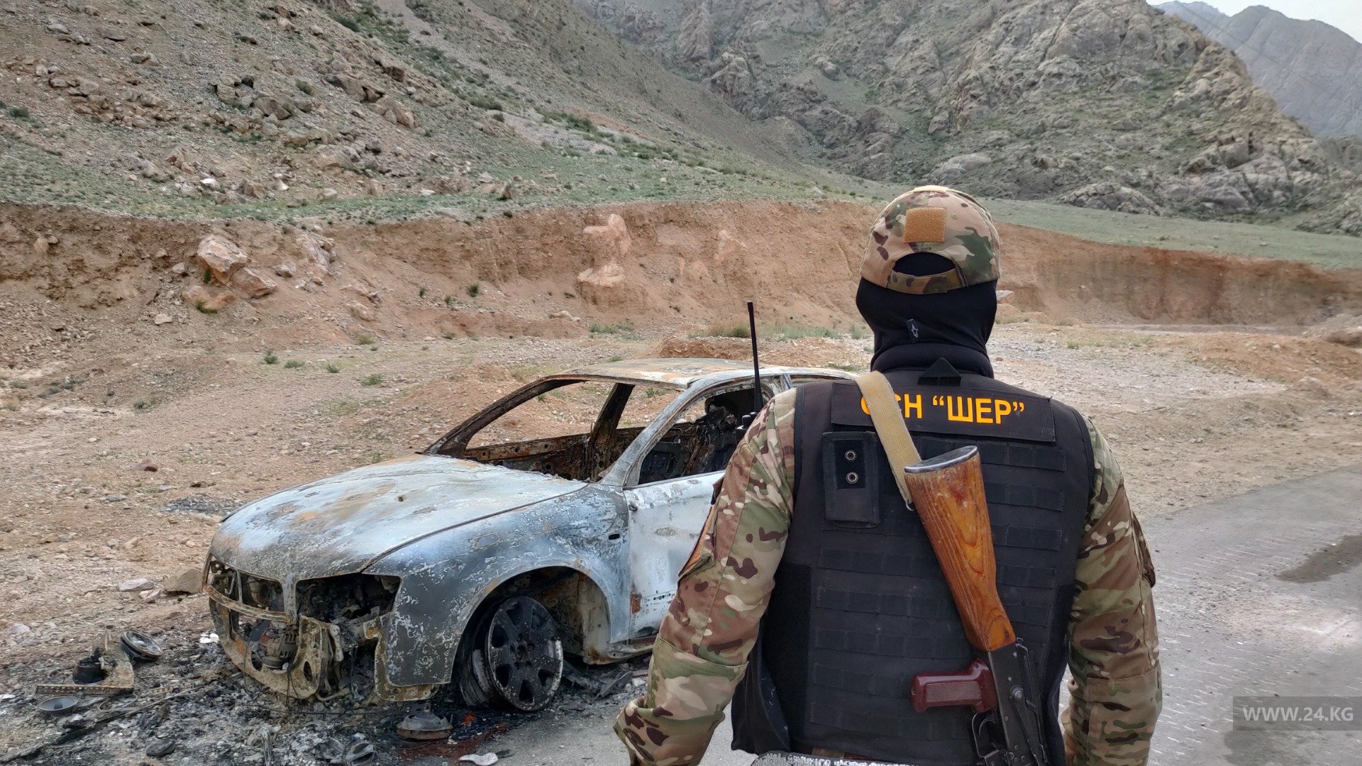 Возле водозабора «Головной» в Баткенской области до сих пор стоит сгоревший автомобиль. Местность охраняют сотрудники отдела специального назначения «Шер» Внутренних войск МВД.