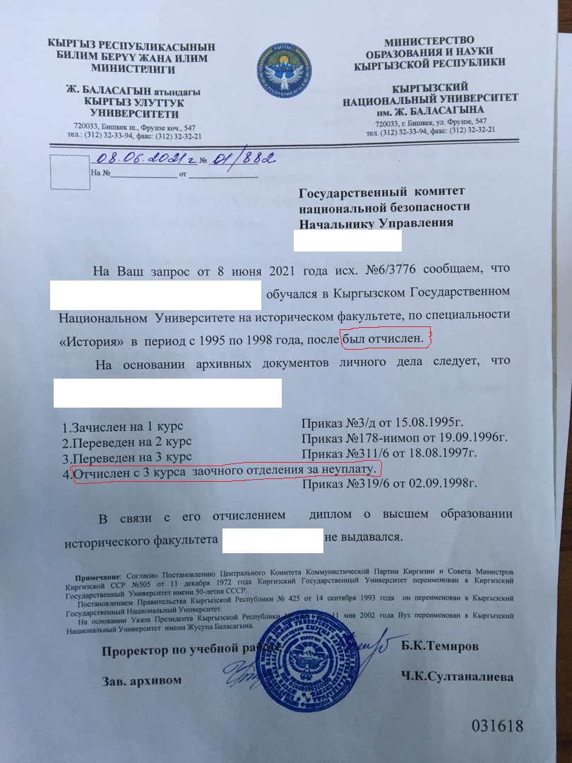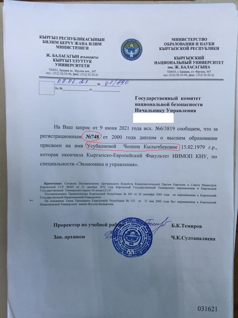 Сообщается также, что согласно полученному ответу КНУ имени Ж.Баласагына, З.Т.З не значится среди выпускников университета, а за указанным номером зарегистрирован диплом, выданный на другого гражданина. Отмечается, что факт вскрылся в ходе досудебной проверки, начатой по делу «Кумтора».