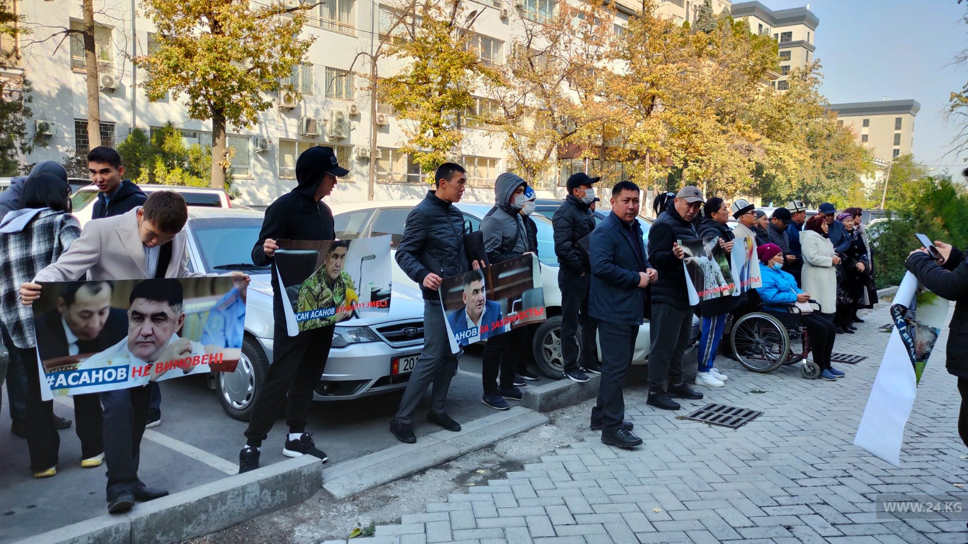 Возле Бишкекского городского суда митингуют сторонники экс-замминистра внутренних дел Курсана Асанова.