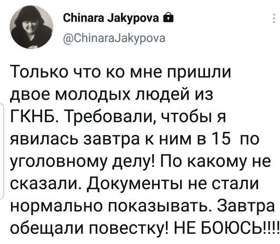 По ее словам, к ней пришли двое молодых людей из ГКНБ. Требовали, чтобы она явилась сегодня к ним в 15.00 по уголовному делу. «По какому, не сказали. Документы не стали нормально показывать. Завтра обещали повестку», — написала Чинара Жакыпова.
