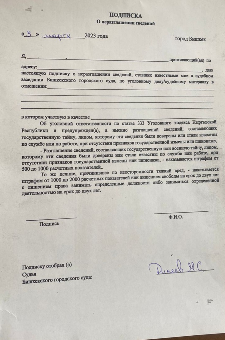 Несколько адвокатов сообщили 24-kg.com, что судьи с них берут подписку о неразглашении.