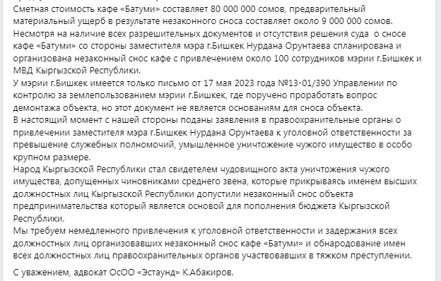 «Предварительный материальный ущерб после незаконного сноса составляет около 9 миллионов сомов. Несмотря на наличие всех разрешительных документов и отсутствие решения суда о сносе кафе, вице-мэр Нурдан Орунтаев организовал незаконный снос кафе с привлечением около 100 сотрудников мэрии и МВД. В муниципалитете имеется только письмо от 17 мая 2023-го, где указывается, что управлению по контролю за землепользованием мэрии Бишкека поручено проработать вопрос демонтажа объекта, но этот документ не является основанием для сноса», — написал юрист.