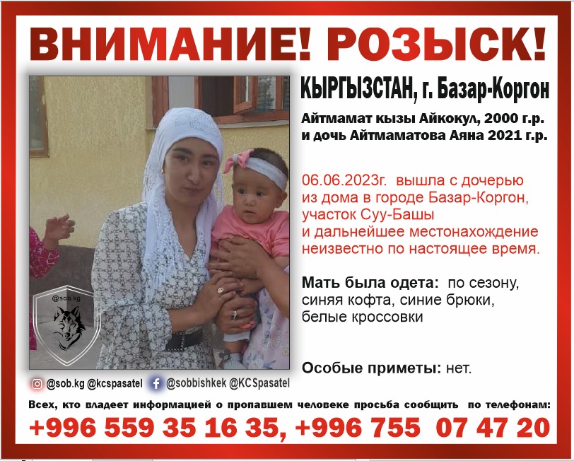В Кыргызстане разыскиваются 23-летняя Айкокул Айтмамат кызы и ее двухлетняя дочь Аяна Айтмаматова. 6 июня женщина вышла из дома в Базар-Коргоне (участок Суу-Баши) и исчезла. Об этом сообщает Совет общественной безопасности.