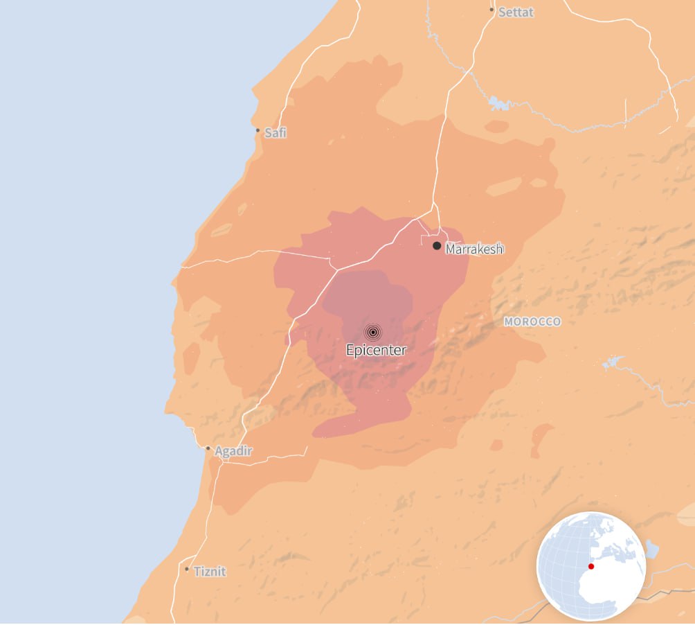 Землетрясение магнитудой 7,2 произошло в горном районе в 80 километрах от Марракеша, сообщил Национальный геофизический институт Марокко. Геологическая служба США, в свою очередь, оценила магнитуду землетрясения в 6,8 и сообщила, что толчки произошли на относительно небольшой глубине — 18,5 километра.