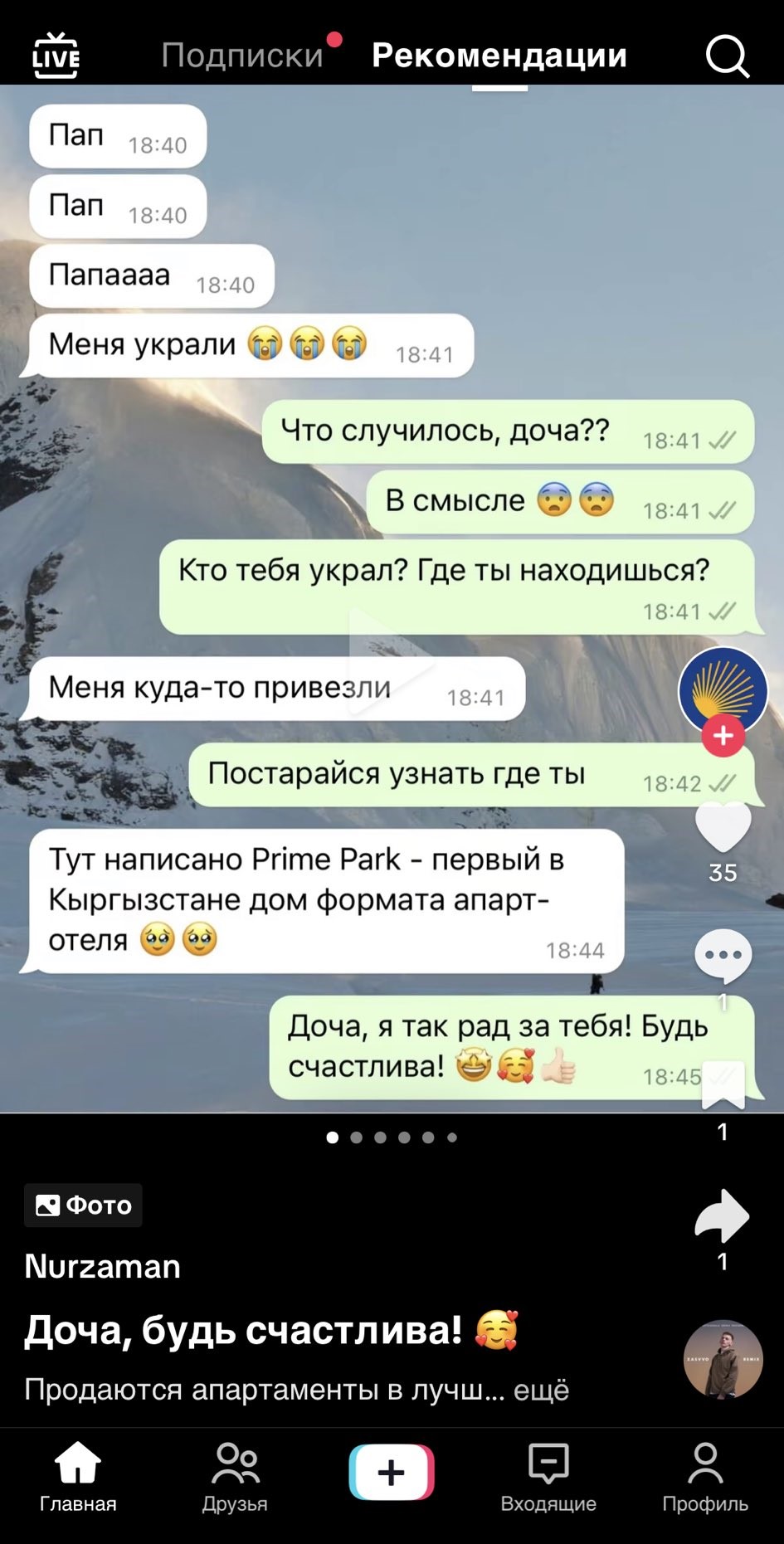 По сюжету поста девушку похитили неизвестные, и она сообщает об этом отцу через мессенджер, просит его о помощи. Однако отец вместо того, чтобы помочь дочери, расспрашивает ее, куда ее привезли. Узнав о том, что дочь попала в один из домов стройкомпании, пожелал ей счастья.