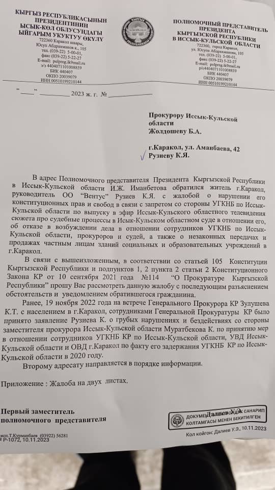 Он предоставил редакции письмо, которое полномочный представитель президента в Иссык-Кульской области направил прокурору региона Бектену Жолдошеву. В нем говорится, что правозащитник обратился к полпреду с жалобой на нарушение его конституционных прав и свобод «в связи с запретом со стороны УГКНБ по Иссык-Кульской области по выпуску в эфир областного телевидения сюжета про судебные процессы».