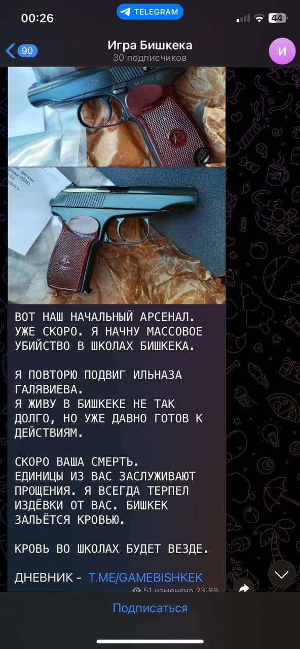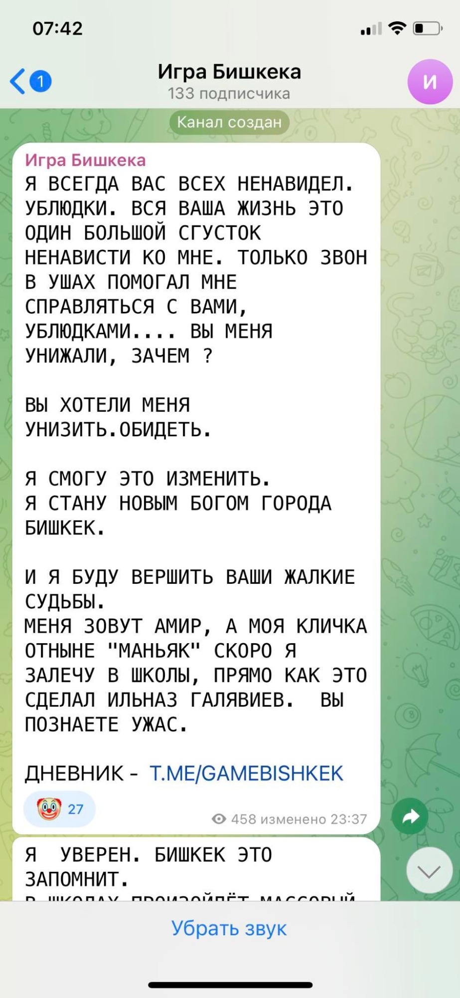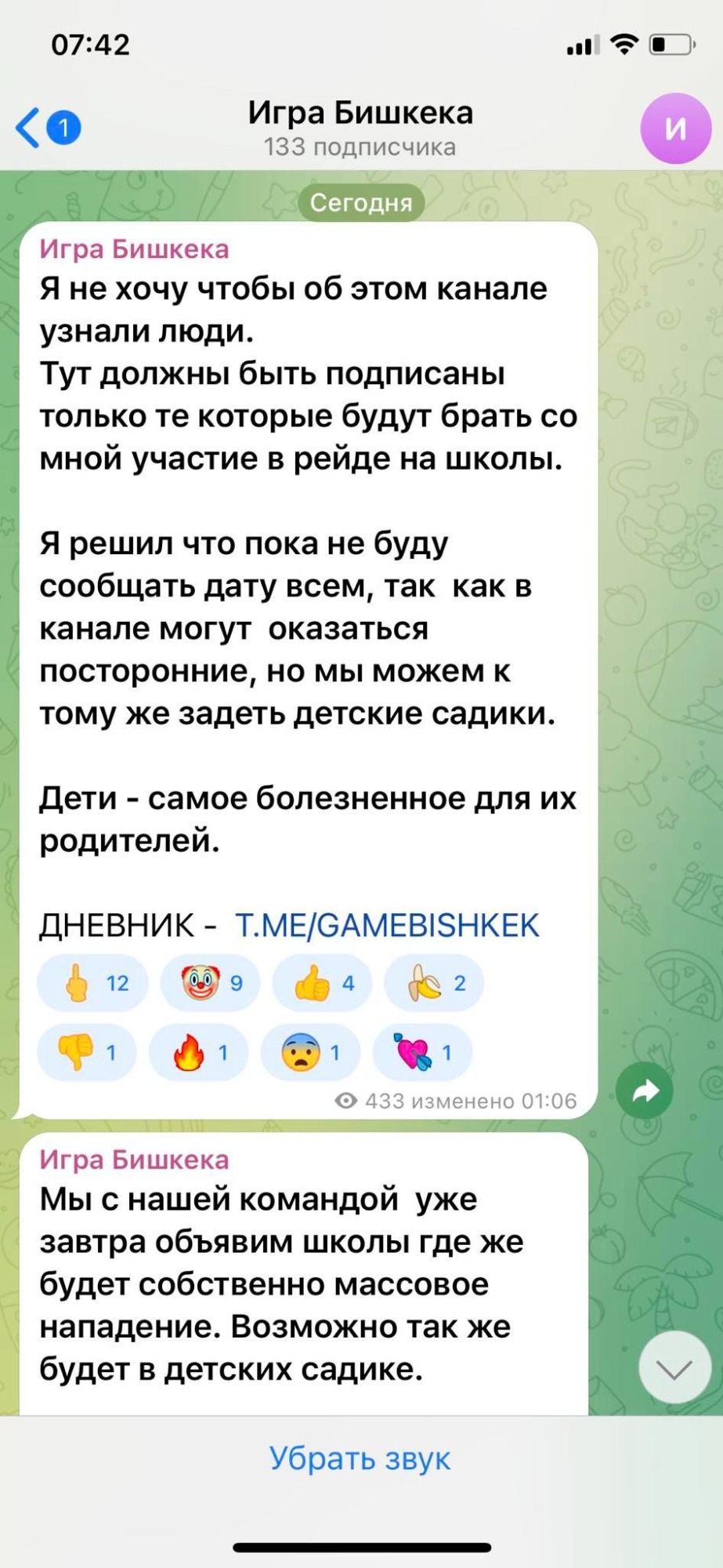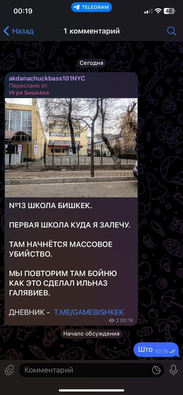 Один из пользователей социальной сети Facebook обратился к главе ГКНБ Камчыбеку Ташиеву с просьбой проконтролировать сообщения, которые распространяют в Telegram-канале «Игра Бишкека». Там говорится о намерении захватить одну из школ и о ненависти к сверстникам.
