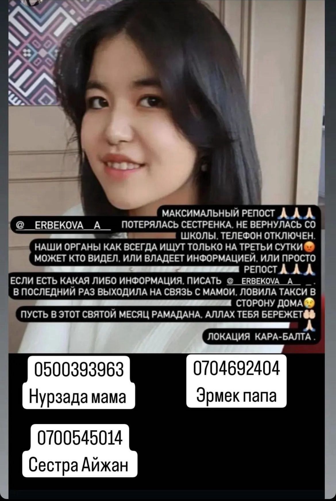 Владеющих какой-либо информацией о местонахождении Адинай Самудиновой в ГУВД региона просят сообщить по номерам: 0312221558, 0313335184, 0701203102 (дежурная часть).