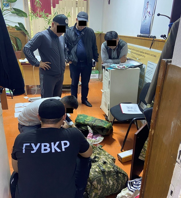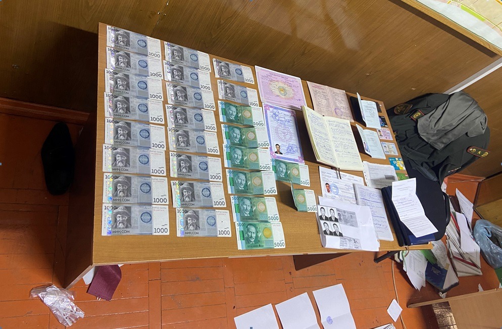 В рабочем кабинете подозреваемого изъяты деньги и пустые бланки с гербовыми печатями, которые использовались для призывников. Задержанный водворен в СИЗО ГКНБ КР.
