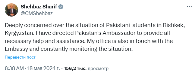 Премьер-министр Пакистана Шахбаз Шариф выразил обеспокоенность инцидентом с участием иностранных граждан в Бишкеке.