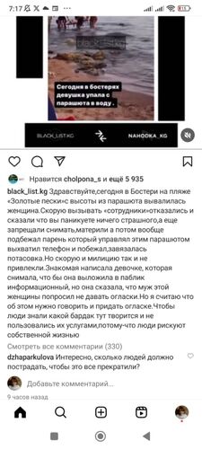 Напомним, 12 июля на пляже одного из пансионатов во время приземления парашюта люди повисли на дереве. После инцидента по решению аппарата полномочного представителя президента в Иссык-Кульской области временно запретили использование парашютов. Несколько дней назад появилась информация, что запрет снят.