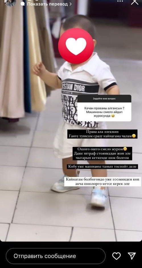 В социальных сетях распространилось видео, на котором девушка едет за рулем, не пристегнувшись ремнем безопасности, и на руках у нее ребенок. Девушка выложила ролик в сторис в Instagram. Там же у нее есть ролики, где она пишет, что ездит по Ошу без водительского удостоверения.