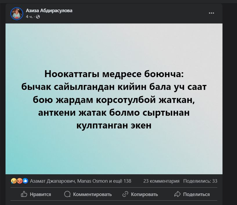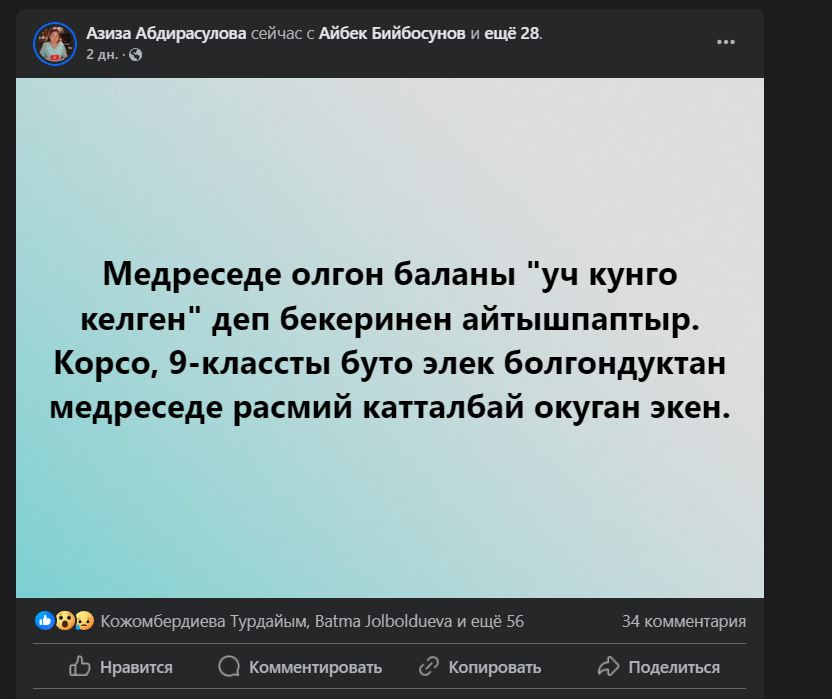 Азиза Абдирасулова отметила, что информация о том, что 14-летнего мальчика родители оставили на три дня в медресе для лечения молитвами (дем салдыруу), недостоверная.