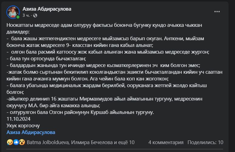 Правозащитница Азиза Абдирасулова на своей странице Facebook поделилась подробностями гибели 14-летнего мальчика в Ноокатском районе Ошской области.