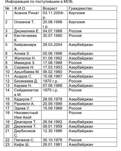 Госпитализированы 10 граждан России, 14 — Азербайджана, 2 — Кыргызстана, 1 человек из Германии (гражданство неизвестно), еще у двоих также гражданство неизвестно. Согласно опубликованному списку, выжившими кыргызстанцами являются 26-летний Тилек Османов и 20-летний Ринат Асанов.