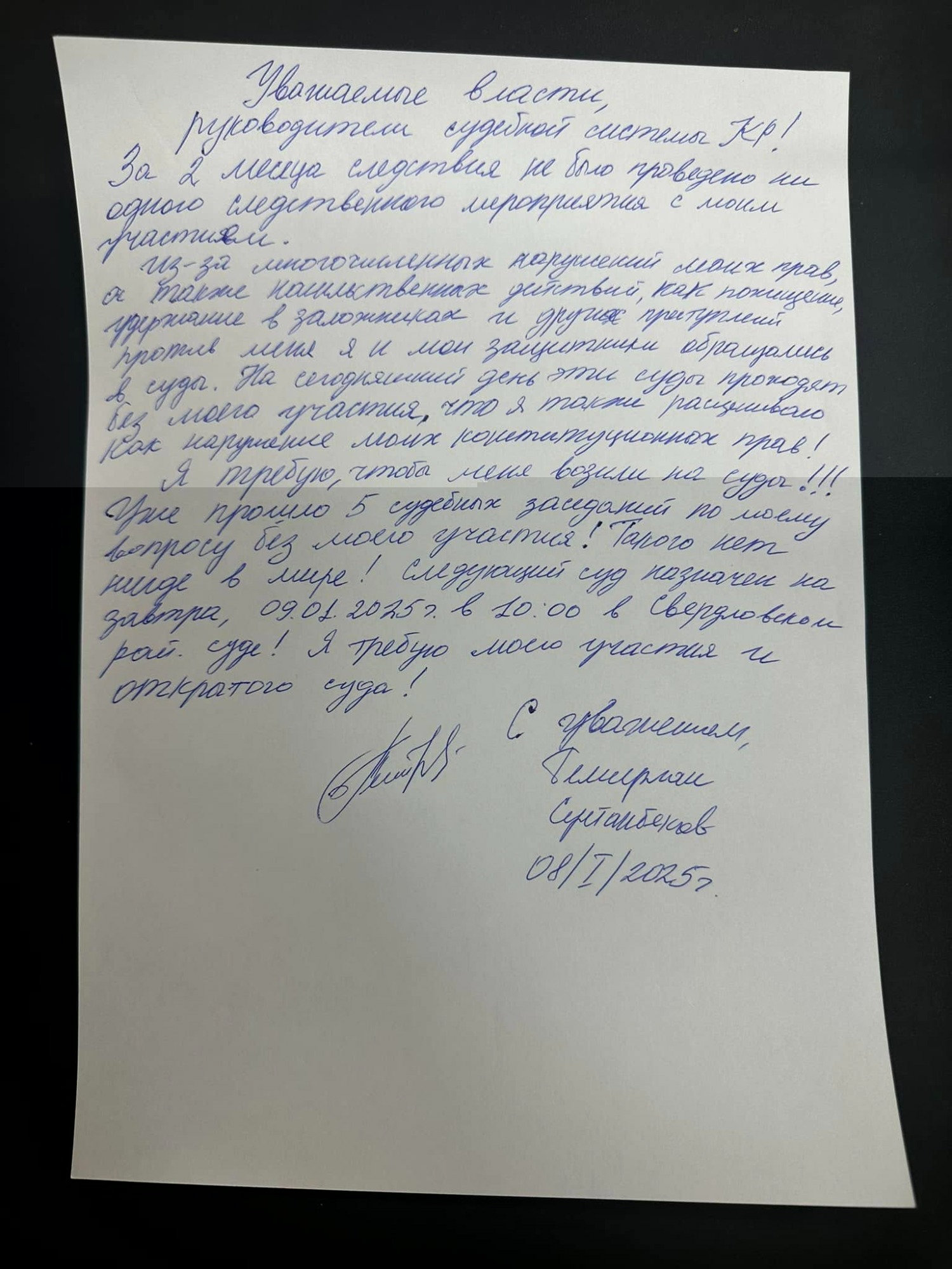 Лидер политической партии «Социал-демократы» Темирлан Султанбеков обратился к властям и руководителям судебной системы КР из СИЗО-1. Он просит доставить его в суд для участия в процессе по его делу.